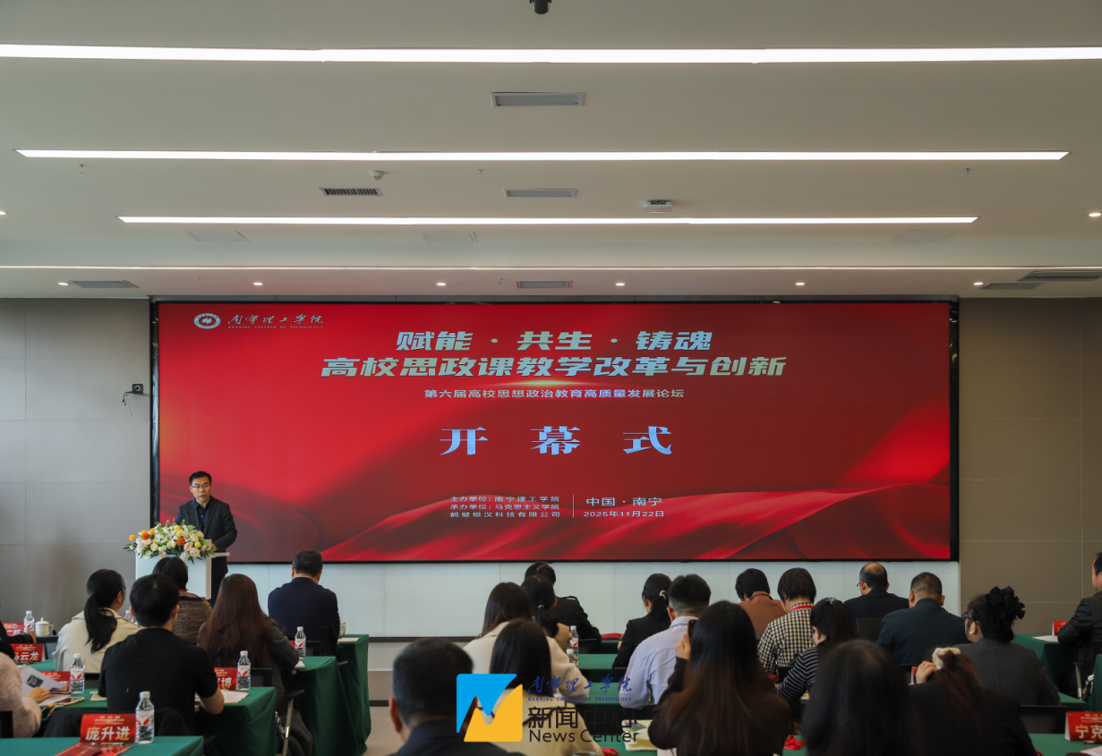 为深入学习贯彻习近平总书记关于思政课建设的重要论述,将党的二十大及历次全会精神有效融入思政课教学,共同探讨数智时代高校思政课改革的前沿理论与实践路径,切实推动高校思政课教学创新发展,2025年11月22日,南宁理工学院成功举办“赋能·共生·铸魂:高校思政课教学改革与创新”——第六届高校思想政治教育高质量发展论坛。本次论坛由南宁理工学院主办、南宁理工学院马克思主义学院承办,桂林电子科技大学马克思主义学院院长邓国峰教授、广西民族大学发展规划处处长陈媛教授、桂林理工大学马克思主义学院党委书记梁英教授、广西师范大学马克思主义学院凌小萍教授应邀参加论坛并作主旨报告。来自桂林理工大学、桂林学院、广西安全工程职业技术学院、广西质量工程职业技术学院、广西自然资源职业技术学院、桂林信息科技学院、广西外国语学院、广西城市职业大学、广西演艺职业学院、广西经济职业学院等10余所高校的专家学者和南宁理工学院思政课教师一起参加此次论坛。